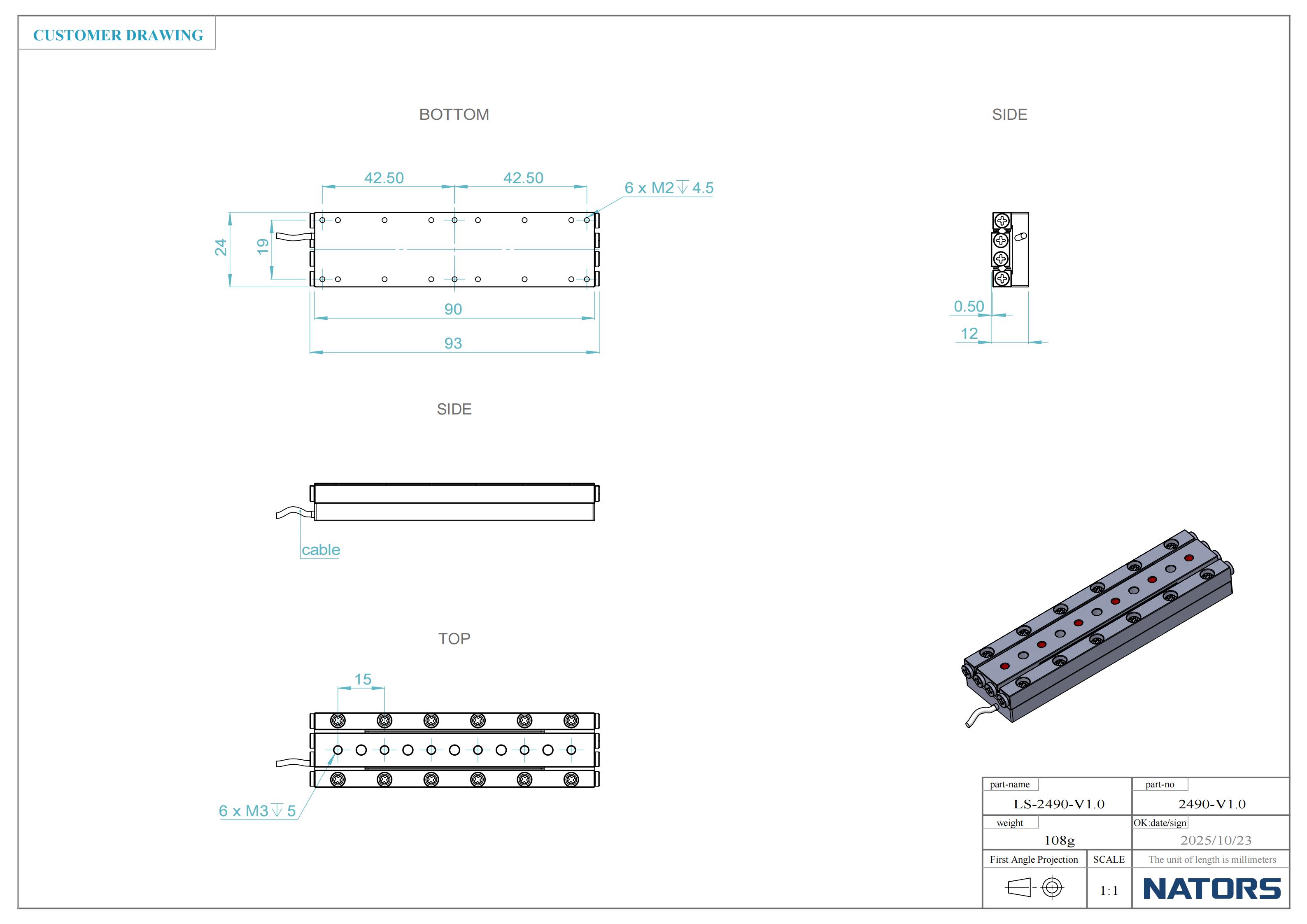 LS-2490的尺寸为90 x 24 x 12mm,行程范围为63mm。